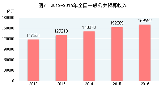 全年全國一般公共預算收入159552億元,比上年同口徑[11]增加6828億元,增長4.5%,其中稅收收入130354億元,增加5432億元,增長4.3%。