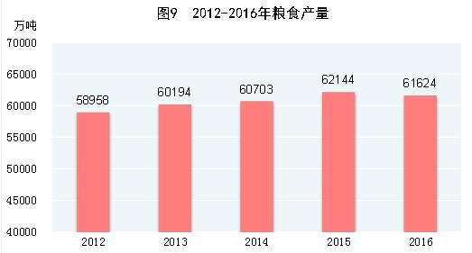 全年糧食產量61624萬噸,比上年減少520萬噸,減產0.8%。其中,夏糧產量13920萬噸,減產1.2%;早稻產量3278萬噸,減產2.7%;秋糧產量44426萬噸,減產0.6%。全年谷物產量56517萬噸,比上年減產1.2%。其中,稻谷產量20693萬噸,減產0.6%;小麥產量12885萬噸,減產1.0%;玉米產量21955萬噸,減產2.3%。