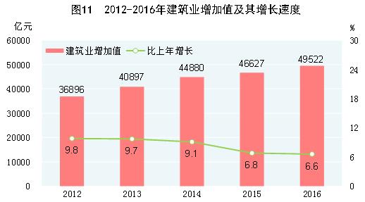 全年全社會建筑業增加值49522億元,比上年增長6.6%。全國具有資質等級的總承包和專業承包建筑業企業實現利潤6745億元,增長4.6%。其中,國有控股企業1879億元,增長6.8%。
