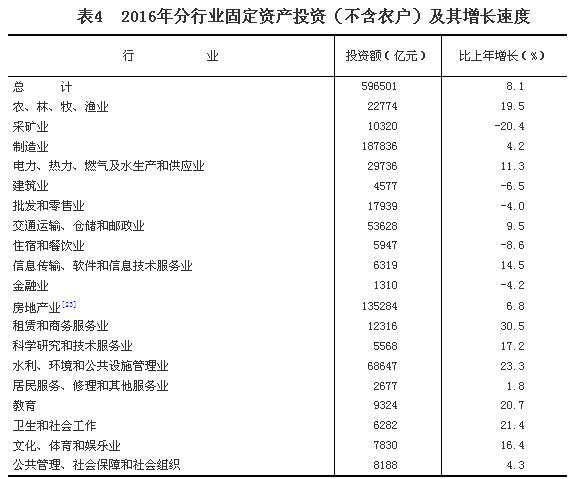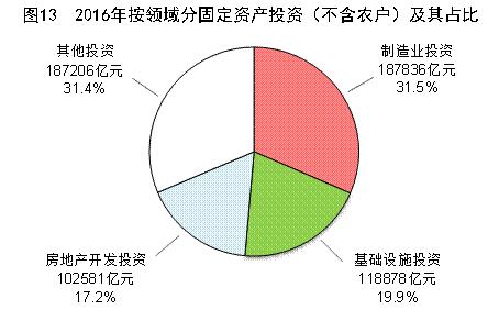 在固定資產投資(不含農戶)中,第一產業投資18838億元,比上年增長21.1%;第二產業投資231826億元,增長3.5%;第三產業投資345837億元,增長10.9%。基礎設施投資[20]118878億元,增長17.4%,占固定資產投資(不含農戶)的比重為19.9%。民間固定資產投資[21]365219億元,增長3.2%,占固定資產投資(不含農戶)的比重為61.2%。高技術產業投資[22]37747億元,增長15.8%,占固定資產投資(不含農戶)的比重為6.3%。六大高耗能行業投資66376億元,增長3.1%,占固定資產投資(不含農戶)的比重為11.1%。農林牧漁業、水利、環境保護等短板領域投資快速增長。