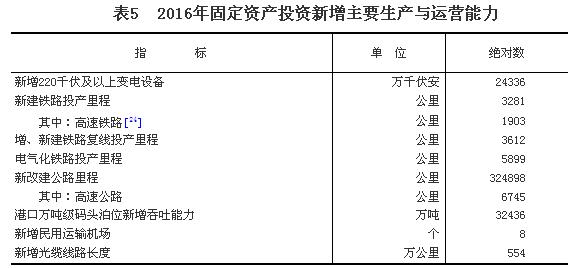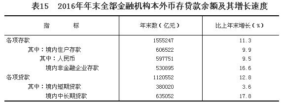 本公報中戶籍人口城鎮化率、民用汽車、交通事故數據來自公安部;城鎮新增就業、登記失業率、社會保障、技工學校數據來自人力資源社會保障部;財政數據來自財政部;外匯儲備、匯率、貨幣金融、公司信用類債券數據來自人民銀行;水產品產量數據來自農業部;木材產量、林業、森林火災數據來自林業局;灌溉面積、水資源數據來自水利部;發電裝機容量、新增220千伏及以上變電設備數據來自中電聯;新建鐵路投產里程、增新建鐵路復線投產里程、電氣化鐵路投產里程、鐵路運輸數據來自鐵路總公司;新改建公路里程、港口萬噸級碼頭泊位新增吞吐能力、公路運輸、水運、港口貨物吞吐量數據來自交通運輸部;新增民用運輸機場、民航數據來自民航局;新增光纜線路長度、電話交換機容量、電話用戶、寬帶用戶、移動互聯網接入流量、上網人數、互聯網普及率、軟件業務收入等數據來自工業和信息化部;農村地區互聯網普及率數據來自中國互聯網絡信息中心;棚戶區住房改造、農村地區建檔立卡貧困戶危房改造、城市污水處理、城市垃圾處理、城市集中供熱面積、建成區綠地數據來自住房城鄉建設部;貨物進出口數據來自海關總署;服務進出口、外商直接投資、對外直接投資、對外承包工程、對外勞務合作等數據來自商務部;管道數據來自中石油、中石化、中海油;郵政業務數據來自郵政局;旅游數據來自旅游局、公安部;上市公司數據來自證監會;保險業數據來自保監會;城鄉低保、農村特困人員救助供養、社會服務、農作物受災面積、洪澇地質災害造成直接經濟損失、旱災造成直接經濟損失、低溫冷凍和雪災造成直接經濟損失來自民政部;教育數據來自教育部;重點研發計劃、科技重大專項、國家重點實驗室、科技成果轉化引導基金、技術合同等數據來自科技部;自然科學基金項目數據來自自然基金委;國家工程研究中心、企業技術中心等數據來自發展改革委;專利數據來自知識產權局;宇航發射數據來自國防科工局;質量檢驗、國家標準制定修訂等數據來自質檢總局;藝術表演團體、博物館、公共圖書館、文化館數據來自文化部;廣播電視、電影、報紙、期刊、圖書數據來自新聞出版廣電總局;檔案數據來自檔案局;體育數據來自體育總局;殘疾人運動員數據來自中國殘聯;衛生數據來自衛生計生委;國有建設用地供應數據來自國土資源部;自然保護區、環境監測數據來自環境保護部;平均氣溫、登陸臺風數據來自氣象局;海洋災害造成直接經濟損失數據來自海洋局;地震次數、地震災害直接經濟損失數據來自地震局;安全生產數據來自安全監管總局;其他數據均來自國家統計局。