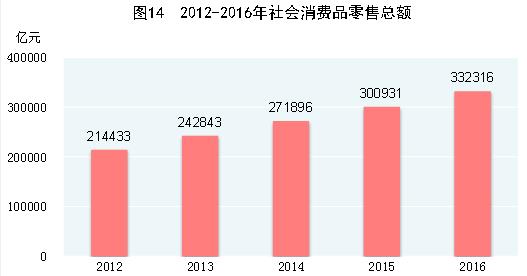 全年社會消費品零售總額332316億元,比上年增長10.4%,扣除價格因素,實際增長9.6%。按經營地統計,城鎮消費品零售額285814億元,增長10.4%;鄉村消費品零售額46503億元,增長10.9%。按消費類型統計,商品零售額296518億元,增長10.4%;餐飲收入額35799億元,增長10.8%。