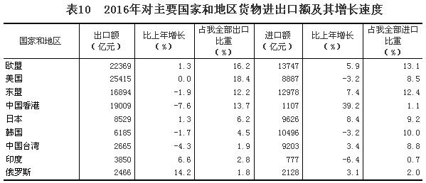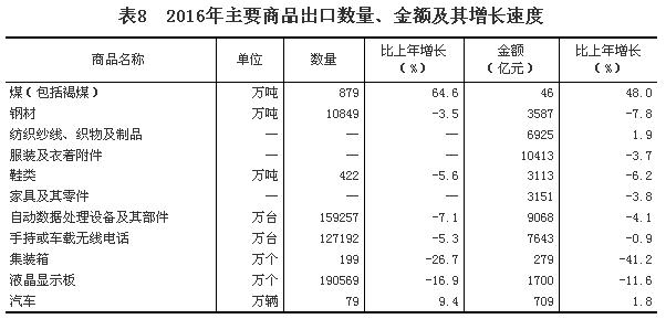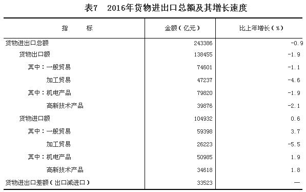 全年貨物進出口總額243386億元,比上年下降0.9%。其中,出口138455億元,下降1.9%;進口104932億元,增長0.6%。貨物進出口差額(出口減進口)33523億元,比上年減少3308億元。對“一帶一路”[28]沿線國家進出口總額62517億元,比上年增長0.5%。其中,出口38319億元,增長0.5%;進口24198億元,增長0.4%。