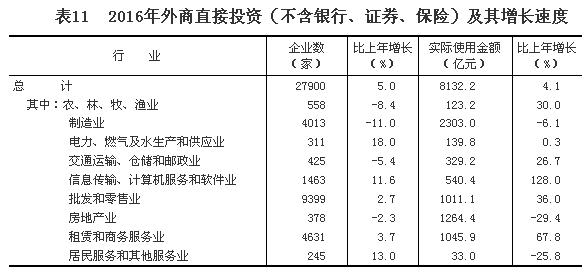 全年吸收外商直接投資(不含銀行、證券、保險)新設立企業27900家,比上年增長5.0%。實際使用外商直接投資金額8132億元(折1260億美元),增長4.1%。其中“一帶一路”沿線國家對華直接投資新設立企業2905家,增長34.1%;對華直接投資金額458億元(折71億美元)。