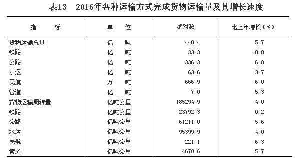 全年貨物運輸總量440億噸,比上年增長5.7%。貨物運輸周轉量185295億噸公里,增長4.0%。全年規模以上港口完成貨物吞吐量118.3億噸,比上年增長3.2%,其中外貿貨物吞吐量37.6億噸,增長4.1%。規模以上港口集裝箱吞吐量21798萬標準箱,增長3.6%。