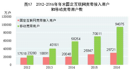 全年完成郵電業務總量[30]43344億元,比上年增長52.7%。其中,郵政行業業務總量7397億元,增長45.7%;電信業務總量35948億元,增長54.2%。郵政業全年完成郵政函件業務36.2億件,包裹業務0.3億件,快遞業務量312.8億件;快遞業務收入3974億元。電信業全年新增移動電話交換機容量[31]7318萬戶,達到218384萬戶。年末全國電話用戶總數152856萬戶,其中移動電話用戶132193萬戶。移動電話普及率上升至96.2部/百人。固定互聯網寬帶接入用戶[32]29721萬戶,比上年增加3774萬戶,其中固定互聯網光纖寬帶接入用戶[33]22766萬戶,比上年增加7941萬戶;移動寬帶用戶[34]94075萬戶,增加23464萬戶。移動互聯網接入流量93.6億G,比上年增長123.7%。互聯網上網人數7.31億人,增加4299萬人,其中手機上網人數[35]6.95億人,增加7550萬人。互聯網普及率達到53.2%,其中農村地區互聯網普及率達到33.1%。軟件和信息技術服務業[36]完成軟件業務收入48511億元,比上年增長14.9%。