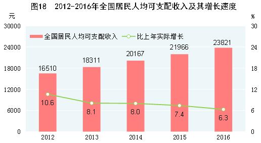 全年全國居民人均可支配收入[42]23821元,比上年增長8.4%,扣除價格因素,實際增長6.3%;全國居民人均可支配收入中位數[43]20883元,增長8.3%。按常住地分,城鎮居民人均可支配收入33616元,比上年增長7.8%,扣除價格因素,實際增長5.6%;城鎮居民人均可支配收入中位數31554元,增長8.3%。農村居民人均可支配收入12363元,比上年增長8.2%,扣除價格因素,實際增長6.2%;農村居民人均可支配收入中位數11149元,增長8.3%。按全國居民五等份收入分組[44],低收入組人均可支配收入5529元,中等偏下收入組人均可支配收入12899元,中等收入組人均可支配收入20924元,中等偏上收入組人均可支配收入31990元,高收入組人均可支配收入59259元。貧困地區[45]農村居民人均可支配收入8452元,比上年增長10.4%,扣除價格因素,實際增長8.4%。全國農民工人均月收入3275元,比上年增長6.6%。