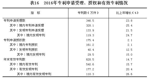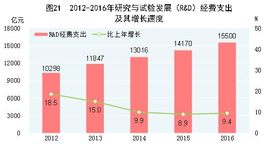全年研究與試驗發展(R&D)經費支出15500億元,比上年增長9.4%,與國內生產總值之比為2.08%,其中基礎研究經費798億元。全年國家重點研發計劃共安排42個重點專項1163個科技項目,國家科技重大專項共安排224個課題,國家自然科學基金共資助41184個項目。截至年底,累計建設國家重點實驗室488個,國家工程研究中心131個,國家工程實驗室194個,國家企業技術中心1276家。國家科技成果轉化引導基金累計設立9支子基金,資金總規模173.5億元。全年受理境內外專利申請346.5萬件,授予專利權175.4萬件。截至年底,有效專利628.5萬件,其中境內有效發明專利110.3萬件,每萬人口發明專利擁有量8.0件。全年共簽訂技術合同32.0萬項,技術合同成交金額11407億元,比上年增長16.0%。