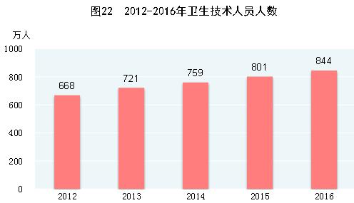 年末全國共有醫療衛生機構99.3萬個,其中醫院2.9萬個,在醫院中有公立醫院1.3萬個,民營醫院1.6萬個;基層醫療衛生機構93.1萬個,其中鄉鎮衛生院3.7萬個,社區衛生服務中心(站)3.5萬個,門診部(所)21.7萬個,村衛生室64.2萬個;專業公共衛生機構2.9萬個,其中疾病預防控制中心3484個,衛生監督所(中心)3138個。年末衛生技術人員844萬人,其中執業醫師和執業助理醫師317萬人,注冊護士350萬人。醫療衛生機構床位747萬張,其中醫院575萬張,鄉鎮衛生院123萬張。全年總診療人次[52]78.0億人次,出院人數[53]2.2億人。