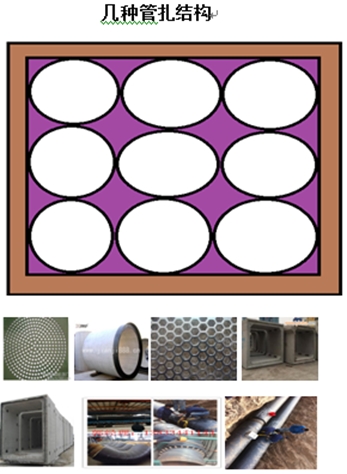 再說扎束形態。如上圖所示。從外形上說,可以有圓形,可以有方形,可以有菱形,可以有漏斗形,可以有長方形等各種形狀;從內外層角度來講,可以有內層和外層雙層結構(含夾層結構),甚至是三、四層等多層結構(也含夾層結構),這個可視具體情況而定。這種綜合型的扎束結構,是非常牢固的。為什么要設計如此牢固的管扎結構呢?主要原因是考慮到將來的下掘深度會非常深,隨著深度增加,管道承受的壓力非常之大,如果沒有足夠牢固的管扎結構是完成不了工程任務的。