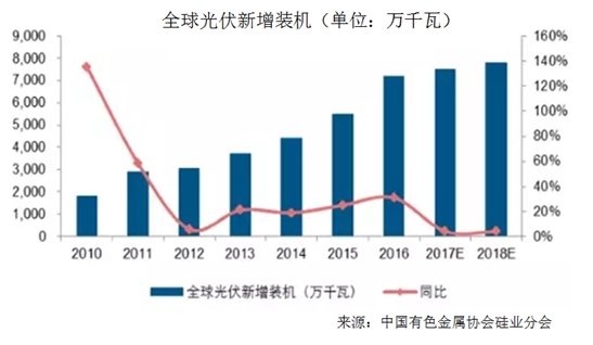 從全球光伏市場需求來看,目前中、日、美光伏裝機需求均逐步進入穩態化發展,而光伏在印度、東南亞、南美等地區的優勢逐步顯現,新興市場光伏裝機維持平穩增長。整體來看,后期全球光伏需求仍將維持穩定增長趨勢,預計2017、2018年全球光伏裝機有望達到75、80吉瓦,中國裝機維持在30吉瓦左右。