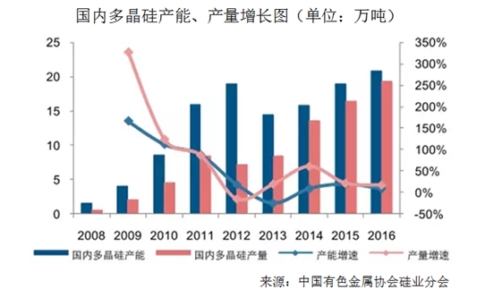 有色金屬協會硅業分會副秘書長馬海天認為,2016年底,中國多晶硅有效產能為21萬噸,可以滿足國內45吉瓦電池片生產的全部原料需求。