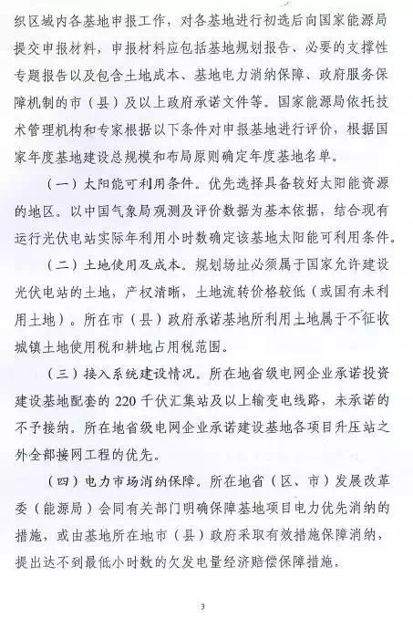 每個省(區、縣)可申報3個基地,總規模不超過2G瓦。2016年光伏發電未達到最低保障小時數的省(區、縣)不得申請。已建成未驗收以及在建基地所在市(縣)級區域不安排新建基地。