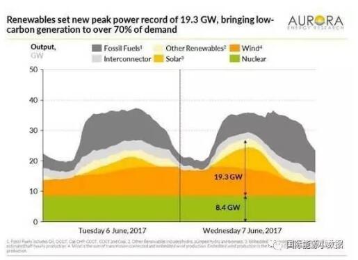 2017年6月7日下午1時,英國可再生能源發電出力達到創紀錄的19.3吉瓦(其中風電9.5吉瓦、太陽能7.3吉瓦),滿足50.7%的電力負荷;而同時核電出力8.4吉瓦、天然氣電廠7.2吉瓦,當時沒有煤電廠運行。值得注意的是,從6月6日-7日的電源結構來看,核電一直穩定在8.4吉瓦,而風電也成為核電之后滿足基荷的電源,煤電廠成了時有時無的調峰電源。