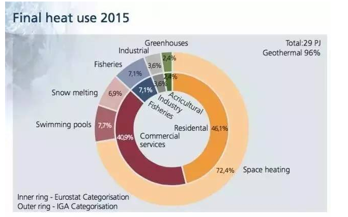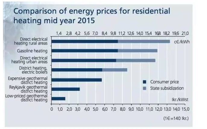 1940年以前,對燃煤供熱的過度依賴導致冰島的霧霾問題十分嚴峻。在短暫地轉(zhuǎn)向進口石油供熱后,冰島著手大規(guī)模地推進地熱供熱項目。截至2015年,據(jù)冰島能源局數(shù)據(jù),該國的地熱供熱比重已經(jīng)達到96%,全面覆蓋了居民、商業(yè)、工業(yè)、農(nóng)業(yè)和漁業(yè),環(huán)境問題得到改善的同時,供熱價格也顯著下降。