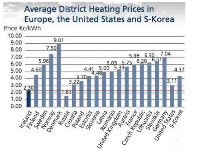 冰島的地熱開發(fā)極具經(jīng)濟性。冰島能源局局長Gundi將冰島和同為高緯度北歐城市的丹麥首都哥本哈根的供熱價格“漢堡包指數(shù)”相對比,在冰島對100平方米面積的住房供熱每月該指數(shù)僅為8,而哥本哈根則高達50。