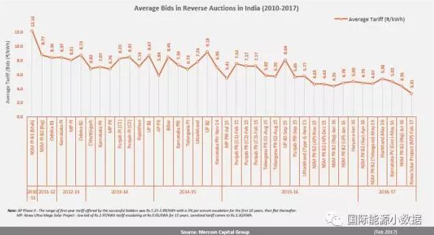 根據Mercom整理的數據,2010年到2017年印度光伏項目競標報價下跌了73%。2010年10月份150兆瓦項目競標報價為12.16盧比(17美分)/千瓦時,到2016年1月已經跌至4.35盧比(7美分)/千瓦時,而2017年最近一次競標的報價已經低至2.44盧比(4美分)/千瓦時。