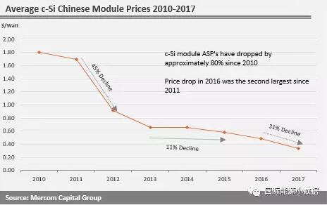 印度光伏報價節節走低與中國制造的光伏電池、組件價格下降密切相關。2010年到2017年,中國生產的晶硅光伏組件下降了80%。2016年下降了31%,是近年來下降幅度最大的一年。