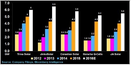 太陽能組件生產商在繼續增加產能,2015年出貨量排名前五的全球五大太陽能組件供應商今年合計新增供應電量有望達到7100兆瓦。這新一輪增長高潮的推手是今年上半年中國國內強勁的太陽能需求,以及在中國以外地區供應產品以獲得出口美國免稅的需求。晶科能源的目標是挑戰天合光能,奪走后者以額定產能計最大生產商的地位。天合光能2016年額定產能高達6500兆瓦。