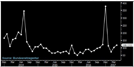 德國太陽能月均安裝量趨勢圖(單位:兆千瓦特)