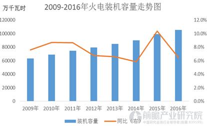 隨著前兩年火電投資項目的陸續投產,短期內火電裝機容量將繼續增長,火電產能過剩不斷加劇,火電盈利空間進一步受壓。據前瞻數據庫數據顯示,2009-2016年中國火電總裝機容量持續增加,截至2016年底,火電裝機容量為105338 萬千瓦,較上年增長6.4%,但環比增速大幅下滑。