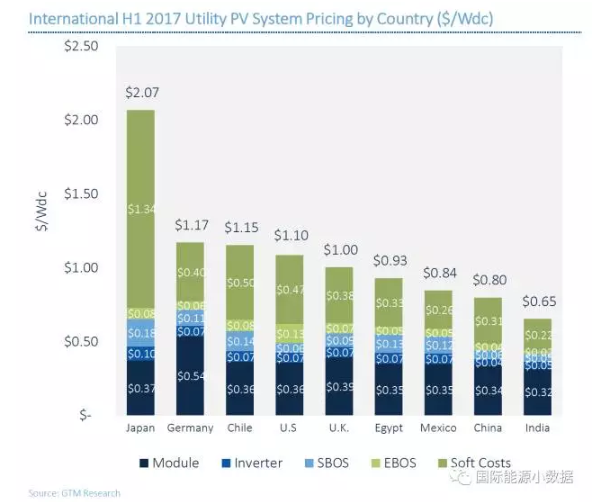 根據GTMResearch提供的數據,2017年大型地面光伏系統價格日本最高,達到2.07美元/瓦(DC),而印度最低,僅為0.65美元/瓦;而中國的成本為0.80美元/瓦。