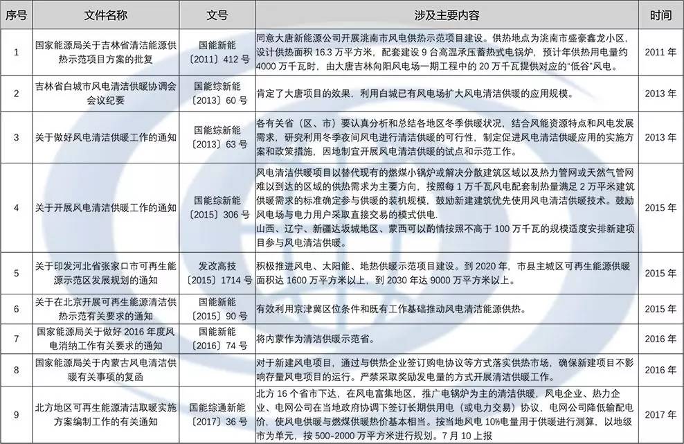 風(fēng)電供暖是解決北方地區(qū)風(fēng)電消納的途徑,也是環(huán)保、減排的需要。從2011年大唐吉林白城風(fēng)電供暖示范項目以來,國家出臺了一系列的相關(guān)政策,本文對這些政策進行了梳理,介紹如下: