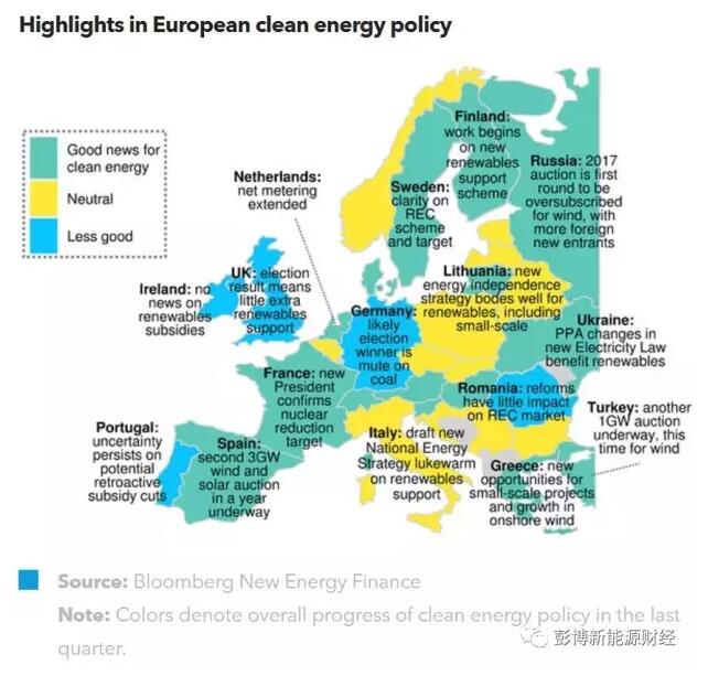 歐盟政府意圖削減可再生能源項目補貼的態度使歐洲近期可再生能源項目招標數量激增 - 相比去年的5GW, 2017年上半年的總招標容量達14GW。在2017年第二季度可再生能源項目政府補貼同比下降49%之后,出現這一招標結果對整個歐洲地區可再生能源項目的投資而言,絕對是個利好消息。歐洲大部分國家出臺的政策都是積極支持可再生能源發電發展的。在本歐洲電力政策展望報告所研究的32個國家中,2017年第二季度支持政策力度減弱的國家有8個,而本季度僅有4個國家面臨這一狀況。