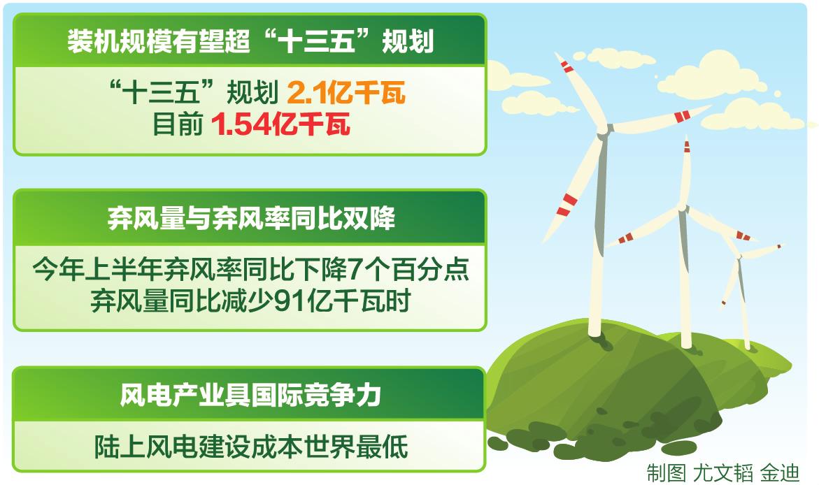國家能源局發布最新數據顯示,截至今年6月底,全國風電新增并網容量601萬千瓦,繼續保持穩步增長勢頭;全國風電發電量1490億千瓦時,同比增長21%;平均利用小時數984小時,同比增長67小時。目前,我國風電累計并網裝機規模1.54億千瓦,已經接近去年底發布的“十三五”規劃提出的2.1億千瓦的預期目標,全線超越指日可待。