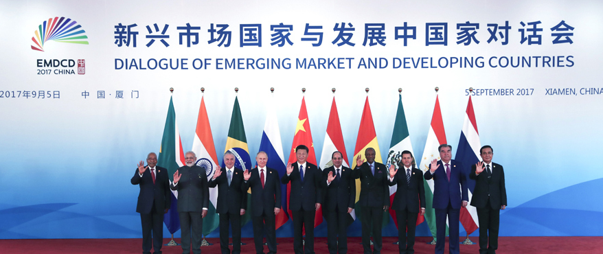 9月5日,國家主席習近平在廈門國際會議中心主持新興市場國家與發展中國家對話會并發表重要講話。金磚國家領導人巴西總統特梅爾、俄羅斯總統普京、印度總理莫迪、南非總統祖馬和對話會受邀國領導人埃及總統塞西、幾內亞總統孔戴、墨西哥總統培尼亞、塔吉克斯坦總統拉赫蒙、泰國總理巴育出席對話會。