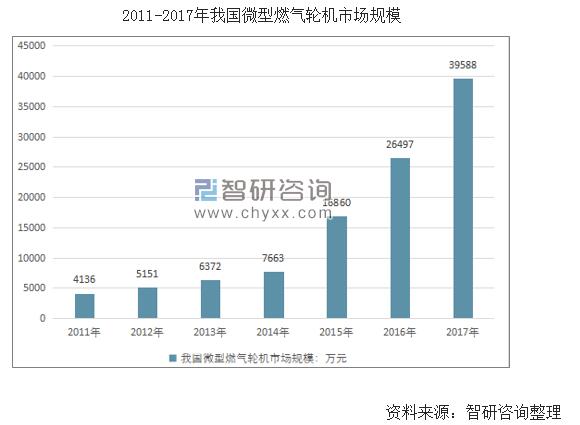 2017年6月,發改委和能源局聯合發布的《依托能源工程推進燃氣輪機創新發展的若干意見》提出,到2020年,各類中小型燃機自主設計制造體系進一步完善,各類中小型燃氣輪機裝備初步實現系列化,滿足各類能源項目需求。近幾年,我國微型燃氣輪機市場發展迅猛,2011年我國微型燃氣輪機市場規模僅4136萬元,到2017年已達到39588萬元,年均復合增長率高達45.71%。按照這個速度發展,預計到2020年我國微型燃氣輪機市場規模將超過10億。