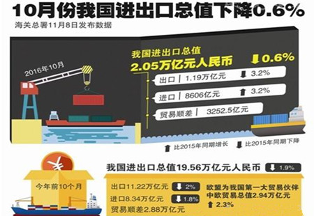 10月份我國(guó)進(jìn)出口總值同比下降0.6%海關(guān)總署8日發(fā)布數(shù)據(jù),10月份,我國(guó)進(jìn)出口總值2.05萬(wàn)億元,比去年同期下降0.6%。其中,出口1.19萬(wàn)億元,下降3.2%;進(jìn)口8606億元,增長(zhǎng)3.2%;貿(mào)易順差3252.5億元,收窄16.8%。 [詳細(xì)]