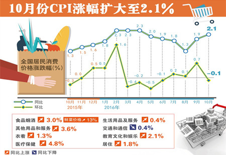 10月份CPI漲幅擴(kuò)大至2.1%國(guó)家統(tǒng)計(jì)局9日發(fā)布數(shù)據(jù),10月份全國(guó)居民消費(fèi)價(jià)格指數(shù)(CPI)同比上漲2.1%,漲幅比上月擴(kuò)大0.2個(gè)百分點(diǎn)。 [詳細(xì)]