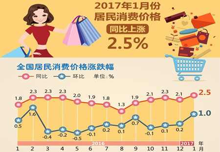 統計局:1月份CPI同比上漲2.5%2017年1月份,全國居民消費價格總水平同比上漲2.5%。其中,城市上漲2.6%,農村上漲2.2%;食品價格上漲2.7%,非食品價格上漲2.5%;消費品價格上漲2.2%,服務價格上漲3.2%。 [詳細]