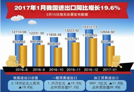 1月進出口延續“回穩勢” 實現“開門紅”19.6%——1月份我國進出口以超出市場預期的增速迎來2017“開門紅”。盡管不乏去年基數較低以及春節因素影響,但業內專家普遍認為,去年下半年以來的外貿回穩向好勢頭仍在延續。 [詳細]