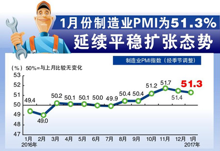 1月份制造業PMI為51.3% 延續平穩擴張態勢國家統計局、中國物流與采購聯合會1日聯合發布數據,2017年1月份,中國制造業采購經理指數(PMI)為51.3%,比上月微落0.1個百分點,延續平穩擴張態勢。 [詳細]