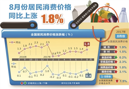 8月份全國居民消費價格同比上漲1.8%國家統計局9日發布的數據顯示,8月份,全國居民消費價格同比上漲1.8%,漲幅比上月擴大0.4個百分點。1至8月平均,全國居民消費價格總水平比去年同期上漲1.5%。 [詳細]