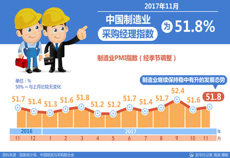 國家統(tǒng)計局解讀:制造業(yè)采購經(jīng)理指數(shù)穩(wěn)中有升2017年11月30日國家統(tǒng)計局服務(wù)業(yè)調(diào)查中心和中國物流與采購聯(lián)合會發(fā)布了中國采購經(jīng)理指數(shù)。11月份,制造業(yè)PMI為51.8%,比上月上升0.2個百分點,高于年均值0.2個百分點,制造業(yè)繼續(xù)保持穩(wěn)中有升的發(fā)展態(tài)勢。 [詳細]