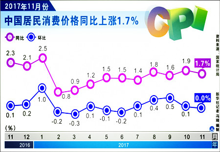 11月CPI同比漲1.7% 連續(xù)10個月維持在“1時代”國家統(tǒng)計局9日發(fā)布的2017年11月份全國居民消費價格指數(shù)(CPI)和工業(yè)生產(chǎn)者出廠價格指數(shù)(PPI)數(shù)據(jù)顯示,CPI環(huán)比持平,同比上漲1.7%,漲幅連續(xù)10個月低于2%;PPI環(huán)比上漲0.5%,同比上漲5.8%。 [詳細]