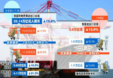 前11月中國外貿(mào)進出口總值增長15.6%海關(guān)總署8日發(fā)布的數(shù)據(jù)顯示,今年前11個月,中國貨物貿(mào)易進出口總值達25.14萬億元人民幣,同比增長15.6%。其中,出口為13.85萬億元,增長11.6%;進口11.29萬億元,增長20.9%。 [詳細]
