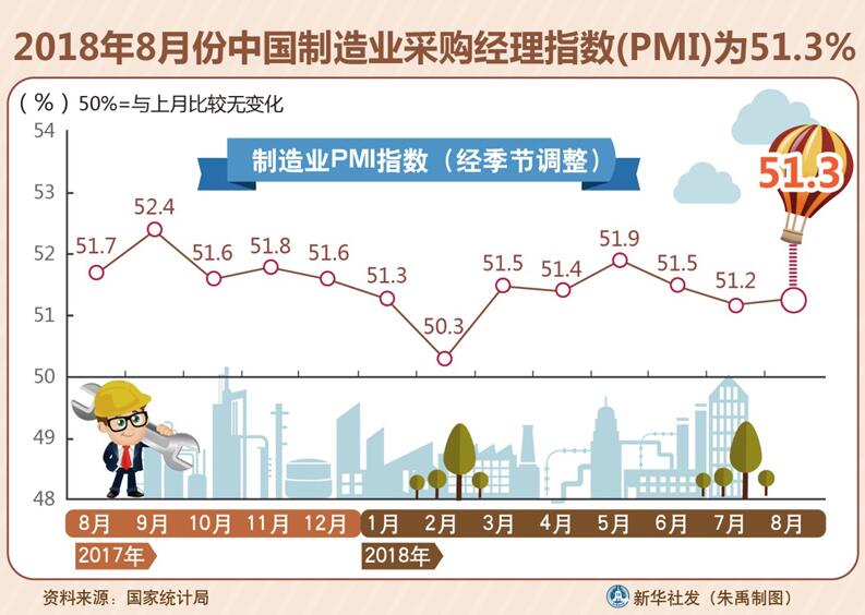 8月制造業PMI為51.3%2018年8月份,中國制造業采購經理指數(PMI)為51.3%,比上月 ,制造業總體保持平穩擴張態勢。從企業規模看,大型企業PMI為52.1%,比上月回落0.3個百分點,繼續高于臨界點;中型企業PMI為50.4%,比上月... [詳細]