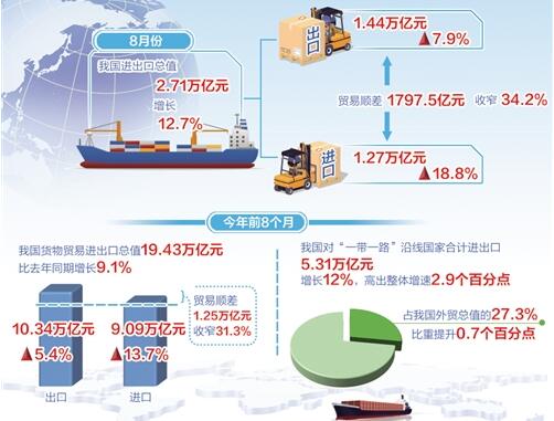 前8個月我國外貿順差大幅收窄31.3%9月8日,海關總署發布今年前8個月外貿進出口情況。數據顯示,今年前8個月我國貨物貿易進出口總值19.43萬億元,比去年同期(下同)增長9.1%。其中,出口10.34萬億元,增長5.4%;進口9.09萬億元,增長13.7%... [詳細]
