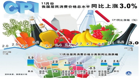 國家統(tǒng)計局昨天公布數(shù)據(jù),2013年11月份CPI同比上漲3.0%,環(huán)比下降0.1%。PPI同比降幅有所收窄,但連續(xù)第21個月為負值,顯示制造業(yè)仍有通縮壓力。市場... [詳細]