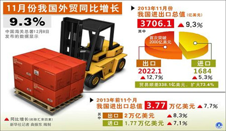 前11月外貿(mào)穩(wěn)定增長 11月份出口創(chuàng)新高海關(guān)總署12月8日公布1至11月外貿(mào)進出口情況。據(jù)海關(guān)統(tǒng)計,今年前11個月,我國進出口總值23.43萬億元人民幣(折合3.77萬億美元),扣除匯率因素同比(下同)增長7.7%。其中出口12.44萬億元人民幣(折合2萬億美... [詳細]