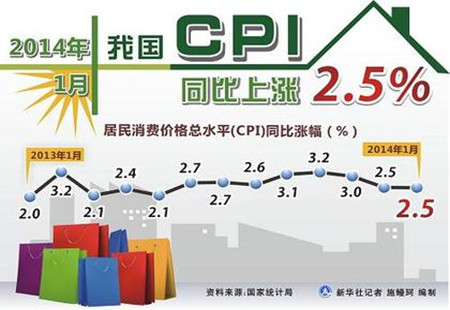 1月CPI漲幅持平上月 創5年來春節當月最低國家統計局14日發布的數據顯示,2014年1月份,全國居民消費價格總水平同比上漲2.5%,與上月持平,創下5年來春節當月CPI漲幅最低值。專家認為,CPI漲幅仍在合理區間運行,今年一季度物價上漲壓力不大。 [詳細]