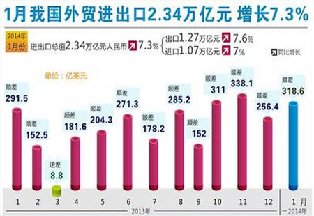 商務部:1月外貿合乎邏輯 虛假出口猜測缺乏根據根據中國海關總署此前公布的數據,2014年1月中國進出口總值為3824億美元,增長(同比,下同)10.3%。其中,出口2071.3億美元,增長10.6%;進口1752.7億美元,增長10%;貿易順差318.6億美元,擴大... [詳細]