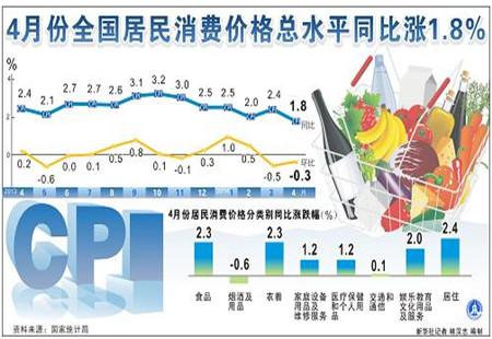 4月份CPI同比漲1.8% 漲幅比上月回落0.6個百分點國家統計局9日發布報告,4月份全國居民消費價格總水平(CPI)同比上漲1.8%,漲幅比上月回落0.6個百分點。國家統計局城市司高級統計師余秋梅解釋說,4月份CPI同比漲幅回落較多,一方面是因為去年4月份受“倒春寒”天氣影... [詳細]