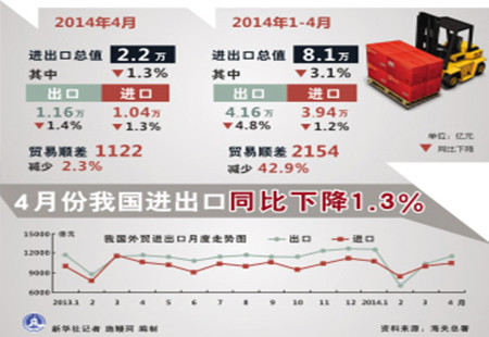 4月份中國外貿進出口小幅下降 出口向好趨勢明顯我國外貿進出口有逐步改善跡象。4月份,我國外貿進出口總值同比小幅下降1.2%,但已較一季度降幅明顯收窄,且出口先導指數進一步走強,顯示未來一段時期出口向好的趨勢更加明顯,這是昨日海關總署發布的。 [詳細]