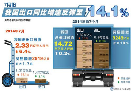 海關總署:7月我國出口大增14.1%海關總署8日公布了今年1至7月外貿進出口情況。今年7月,我國出口達1.31萬億元,同比增長14.1%,這是今年我國的出口數據首度出現兩位數增長,增速超過預期一倍。 [詳細]
