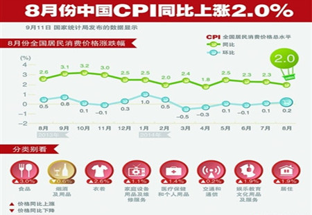 解讀:8月CPI創(chuàng)4個月新低 對市場影響不大國家統(tǒng)計局周二公布的數(shù)據(jù)顯示,2014年8月消費者價格指數(shù)(CPI)同比上升2.0%,創(chuàng)下四個月新低;較7月同比升2.3%有所縮小,且低于預(yù)期。工業(yè)生產(chǎn)者價格指數(shù)(PPI)同比下降1.2%,環(huán)比下降0.2%。 [詳細(xì)]